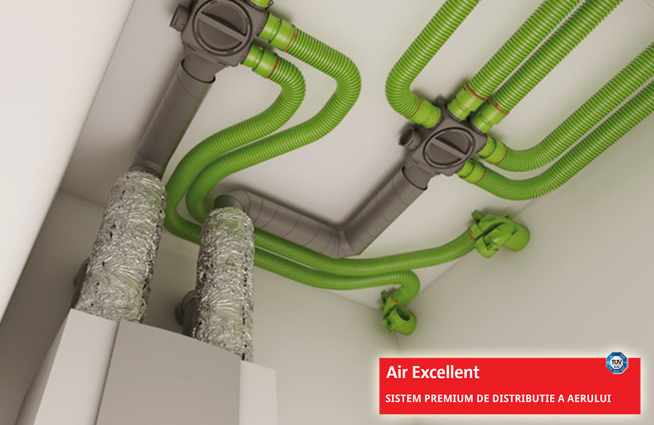 În linii mari, există patru sisteme de ventilație. Cele mai utilizate sunt: sistemul C (extragere automată a aerului) și sistemul D (ventilație echilibrată). Ventilația echilibrată este utilizată din ce în ce mai mult pentru a satisface cerințele NZEB, dar în zilele noastre există și sisteme C bazate pe cerere, care ventilează foarte eficient. Air Excellent este potrivit pentru alimentarea și extragerea de aer și are o cutie de distribuție prin care se realizează acest lucru. Puteți realiza distribuția completă a aerului cu un singur sistem. Cutia de distribuție a aerului simplifică designul și în plus este noise friendly cu cei care locuiesc în casă, mai exact împiedică transmiterea zgomotului.