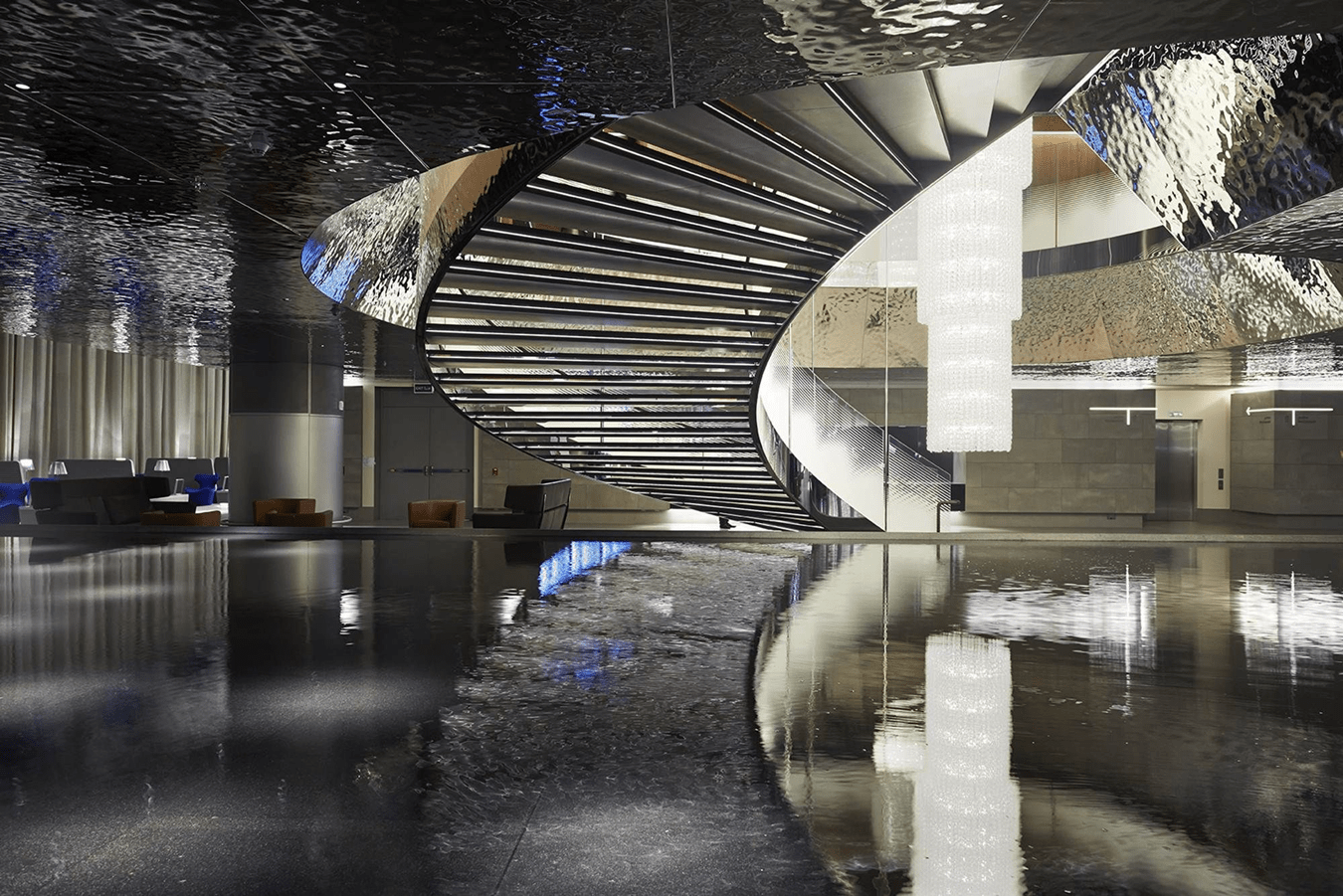 Un exemplu de interior care utilizează o mulțime de oțel este aeroportul Doha din Qatar. Aici, în salonul VIP, găsim nu doar fitingurile prin presare utilizate pentru sistemul de fântâni arteziene impunător, ci și o utilizare largă a foliilor decorative din oțel inoxidabil AISI 316L.